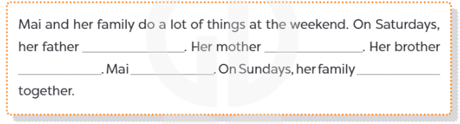Mai và gia đình cô ấy làm rất nhiều việc vào cuối tuần. Vào các ngày thứ Bảy, bố cô ấy đến trung tâm thể thao. Mẹ cô đi siêu thị. Anh trai cô đi đến sở thú. Mai làm bài tập ở nhà. Vào chủ nhật, gia đình cô ăn tối cùng nhau.