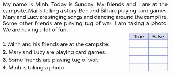 My name is Minh. Today is Sunday. My friends and I are at the campsite. Mai is telling a story. Ben and Bill are playing card games. Mary and Lucy are singing songs and dancing around the campfire. Some other friends are playing tug of war. I am taking a photo. We are having a lot of fun.