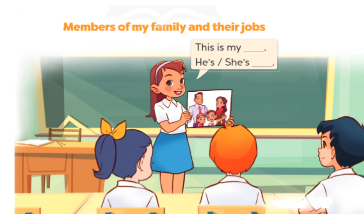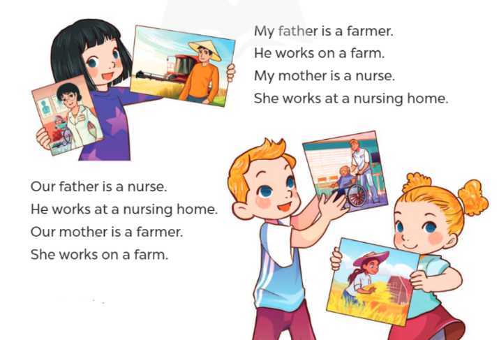 Nhìn vào bức ảnh của gia đình tôi. Đây là mẹ của tôi. Cô ấy là một y tá. Cô ấy làm việc tại một viện dưỡng lão. Đây là bố tôi. Anh ấy là một công nhân. Anh ấy làm việc tại một nhà máy. Đây là tôi. Tôi là học sinh. Tôi học tại một trường tiểu học.