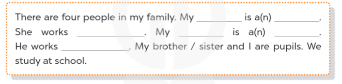 There are four people in my family. My mother is a nurse. She works at a nursing home. My father is a worker. He works at a factory. My sister and I are pupils. We study at a school.