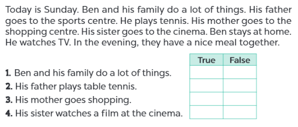 Hôm nay là chủ nhật. Ben và gia đình anh ấy làm rất nhiều thứ. Cha anh đi đến trung tâm thể thao. Anh ấy chơi tennis. Mẹ anh đi đến trung tâm mua sắm. Em gái anh ấy đi xem phim. Ben ở nhà. Anh ấy xem tivi. Vào buổi tối, họ có một bữa ăn ngon cùng nhau.