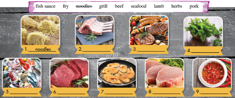 New Words a. Fill in the blanks. Listen and repeat. b. Take turns using the words in sentences. Listening a. Listen to a man talking about popular food from around the world. Who is the speaker? b. Now, listen and fill in the blanks, then match with the correct pictures. Useful Language Listen and then practice. Reading a. Read the article and circle the best headline.