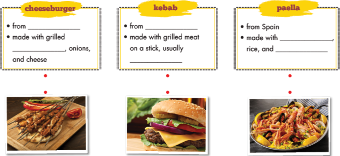 Chef: OK, everyone, quiet, please. Today, I’m going to show you how to make some dishes from around the world. First of all, we have cheeseburgers. Cheeseburgers are popular in the USA. People make them with grilled beef, onions, and cheese. Next, we have kebabs. Many people eat kebabs in Turkey. A kebab is grilled meat on a stick, usually lamb. Last but not least, we have paella Paella is a seafood-style dish. People in Spain cook and eat this food. They make paella with seafood, rice, and some vegetables. Now, wash your hands and get ready to cook.