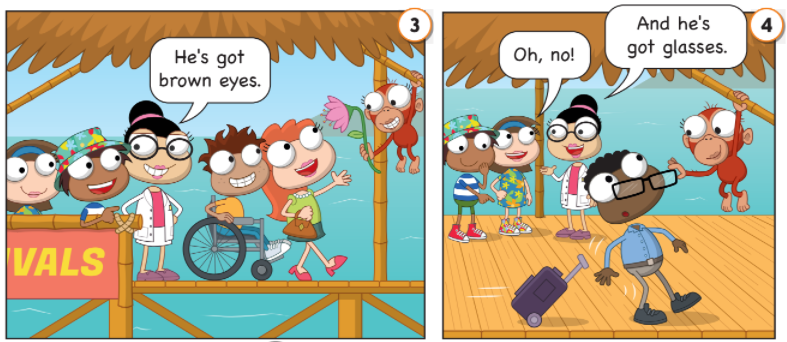 4. Woman: And’ he got glasses.