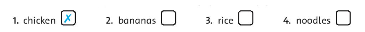 (Họ có những món ăn gì? Hãy đánh dấu tích hoặc dấu nhân vào ô trống.)