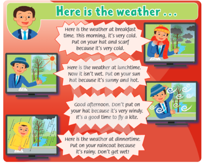 Here is the weather at breakfast time. This morning, it’s very cold. Put on your hat and scarf because it’s cold.