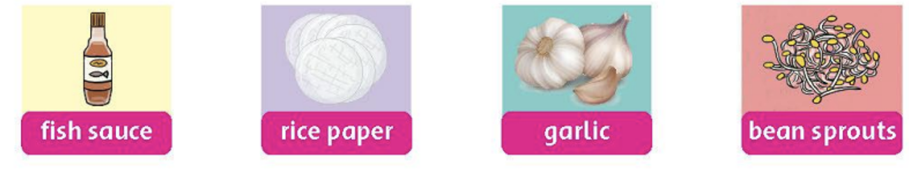 In the pictures, there are some rice paper, fish sauce, chicke, garlic, mushrooms and bean sprouts.
