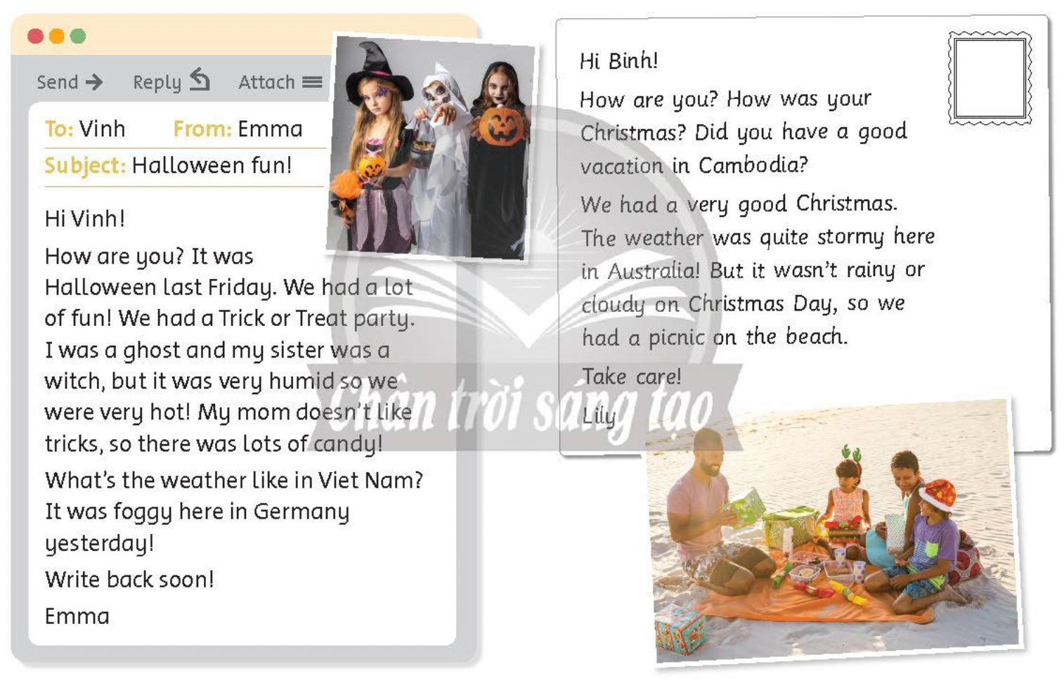 Bạn có khỏe không? Đó là Halloween Thứ Sáu tuần trước. Chúng tớ đã có rất nhiều niềm vui! Chúng tớ đã có một bữa tiệc ‘Cho kẹo hay bị ghẹo’. Tớ là 1 con ma và chị tớ là phù thủy, nhưng trời rất ẩm ướt nên chúng tớ rất nóng! Mẹ tớ không thích bị ghẹo nên có rất nhiều kẹo! Thời tiết ở Việt Nam như thế nào? Hôm qua ở Đức có sương mù đấy!