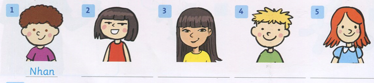 Can you see Thi? She has long, red hair. Khoa and Nhan have short hair. Khoa’s T-shirt is green. Nhan’s T-shirt is purple. He has curly, brown hair.