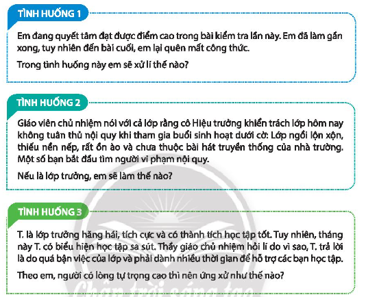 Đóng vai xử lý tình huống. + Tình huống 1: Em đang quyết tâm đạt được điểm cao trong bài kiểm tra lần này…. Trao đổi với bạn về tầm quan trọng của việc nâng cao lòng tự trọng ở mỗi học sinh.