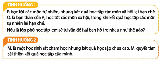 + Tình huống 1: Nếu là lớp phó học tập, em sẽ tư vấn hai bạn nên học nhóm với nhau, hỗ trợ nhau cải thiện những môn chưa tốt, cùng nhau phấn đấu học tập.