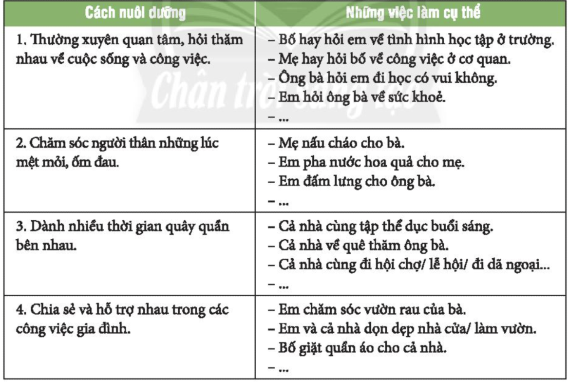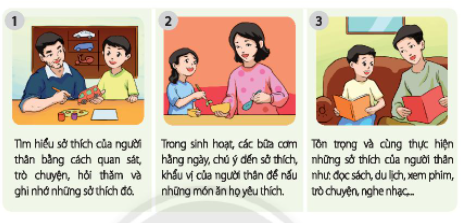 Thực hiện những việc làm thể hiện sự quan tâm của em đến sở thích của người thân theo gợi ý sau. Chia sẻ với thầy cô và các bạn những cảm xúc của người thân khi em quan tâm đến sở thích của họ.