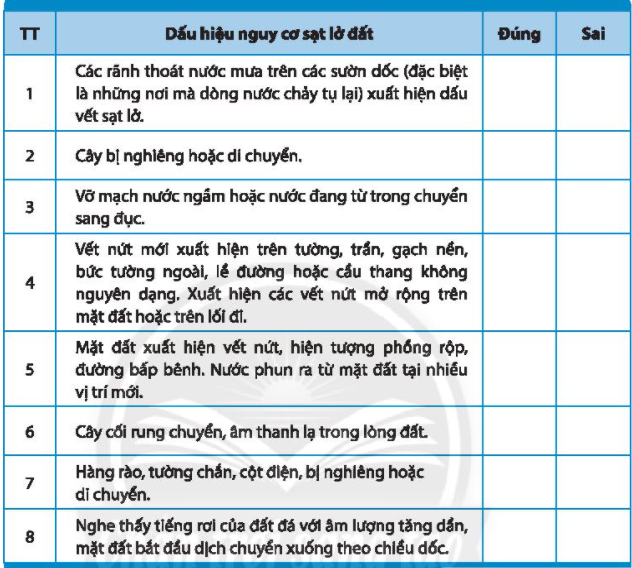 Đánh dấu X vào cột “Đúng” hoặc “Sai” với những dấu hiệu nguy cơ sạt lở đất.