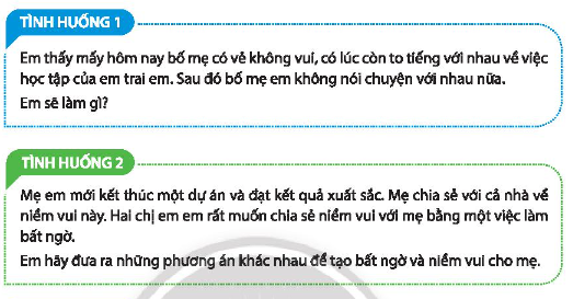 + Tình huống 1: Em sẽ đi hỏi han tình hình học tập của em trai; sau đó, tìm thời điểm thích hợp để nói chuyện với bố mẹ  về tình hình, nguyện vọng của em trai, giúp bố mẹ hiểu hơn về tình hình, đồng thời cả gia đình lên kế hoạch học tập để giúp em có định hướng học tốt hơn.