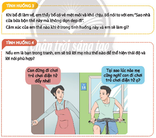 + Tình huống 3: Em sẽ xin lỗi bố vì đã không dọn dẹp nhà cửa gọn gàng, sau đó lấy cho bố cốc nước để bố uống, nghỉ ngơi và em sẽ đi dọn dẹp nhà ngay lập tức.