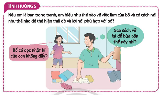 + Tình huống 5: Em sẽ xin lỗi bố vì đã không dọn dẹp bàn học gọn gàng, đồng thời hứa với bố lần sau sẽ gọn gàng ngăn nắp hơn.