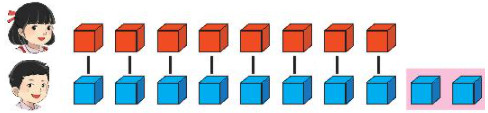 Quan sát tranh vẽ ta thấy bạn trai có 10 cái kẹo, bạn gái có 8 cái kẹo. Mà 10 – 8 = 2, từ đó dùng đồ dùng học tập thể hiện bạn trai có nhiều hơn bạn gái 2 cái kẹo.