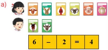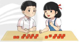 Quan sát tranh vẽ ta thấy bạn trai có 10 cái kẹo, bạn gái có 8 cái kẹo. Mà 10 – 8 = 2, từ đó dùng đồ dùng học tập thể hiện bạn trai có nhiều hơn bạn gái 2 cái kẹo.