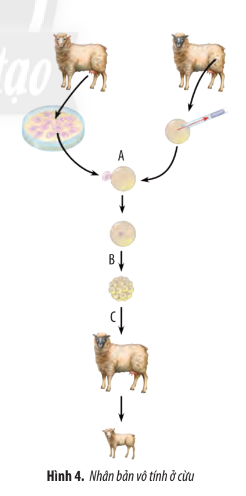 Hình 4 mô tả quá trình nhân bản vô tính ở cừu. Hãy cho biết tên gọi của các giai đoạn (A), (B), (C).