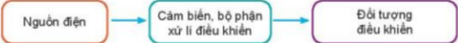 – Mô tả: Mạch điện điều khiển đơn giản thường gồm: nguồn điện; cảm biến, bộ phận xử lí và điều khiển; đối tượng điều khiển. Trong đó, nguồn điện cung cấp năng lượng điện cho mạch. Cảm biến cảm nhận và biến đổi đại lượng vật lí, hóa học, sinh học cần đo thành tín hiệu điện. Bộ phận xử lí và điều khiển tiếp nhận và xử lí tín hiệu điện từ cảm biến thành tín hiệu điều khiển tới đối tượng điều khiển. Đối tượng điều khiển được điều khiển để thực hiện một chức năng nào đó.