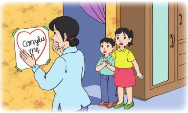 Người mẹ chạy vào phòng làm việc để xác minh nỗi lo lắng của mình. Nhưng khi nhìn bức tường, đôi mắt bà tràn ngập nước mắt. Những gì bà đọc được như một mũi tên xuyên qua tâm hồn người mẹ. Dòng chữ viết: “Con yêu mẹ” được viền bằng một trái tim!
