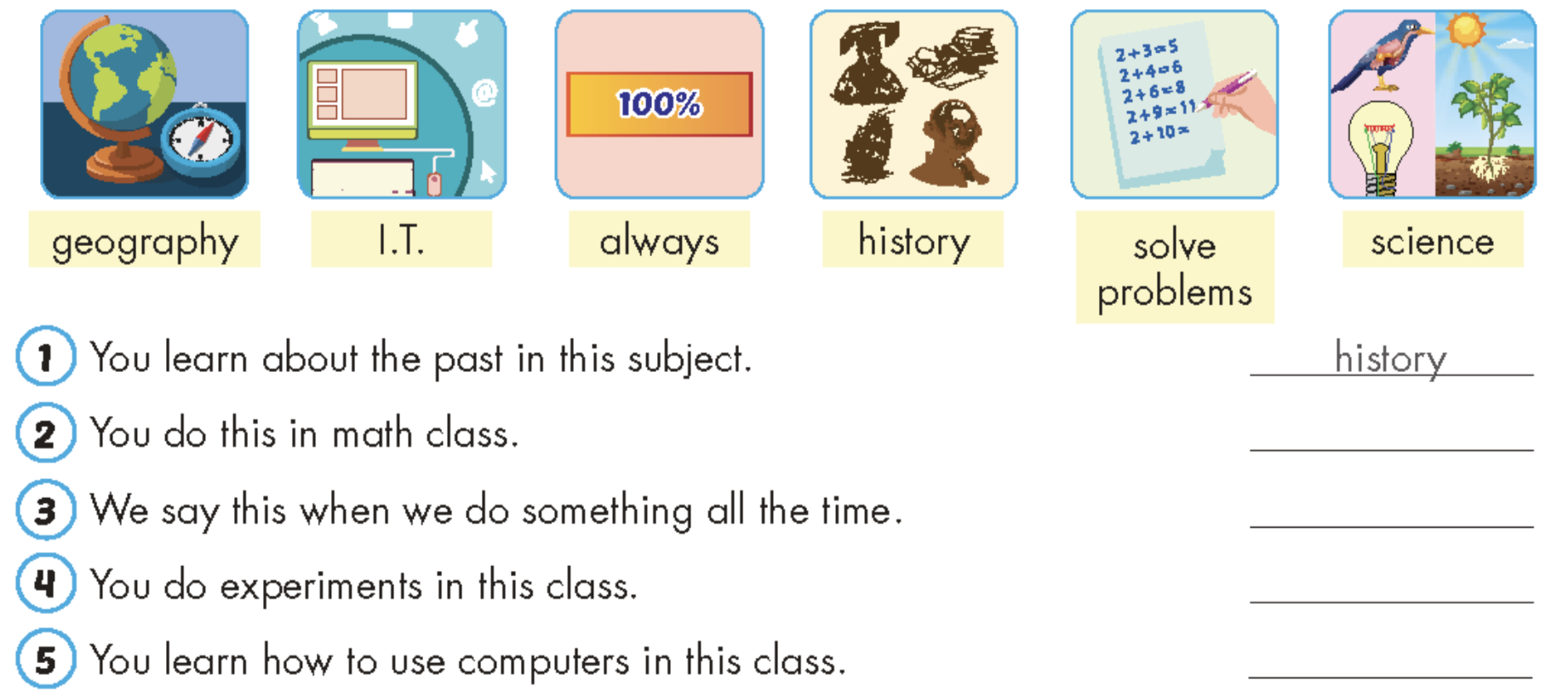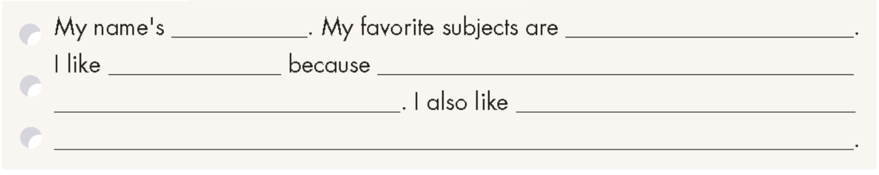 Listen and match. There is an example. Look and read. Write the correct words. There is an example. Write about your favorite subjects. Play the board game.
