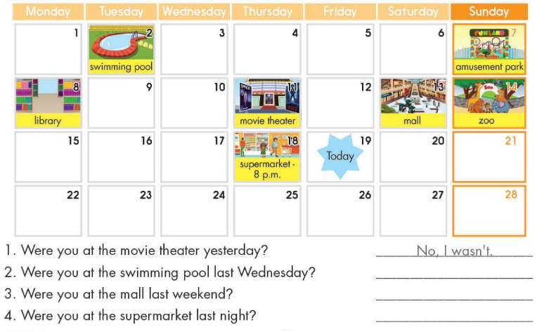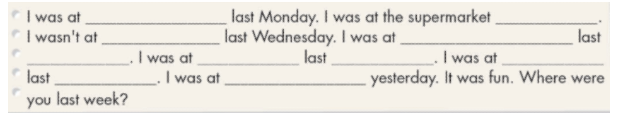 I was at the playground last Monday. I was at the supermarket last Tuesday. I wasn’t at the park last Wednesday. I was at the movie theater last Thursday. I was at the mall last Friday. I was at the zoo last Saturday.  I was at the swimming pool yesterday. It was fun. Where were you last week?