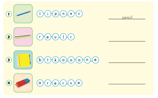 (Nhìn vào hình. Nhìn vào các chữ cái. Viết các từ.)