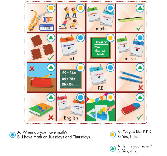 Ô có biểu tượng này thì trong ô sẽ là hình ảnh về đồ dùng học tập. Một bạn hỏi, một bạn trả lời.
