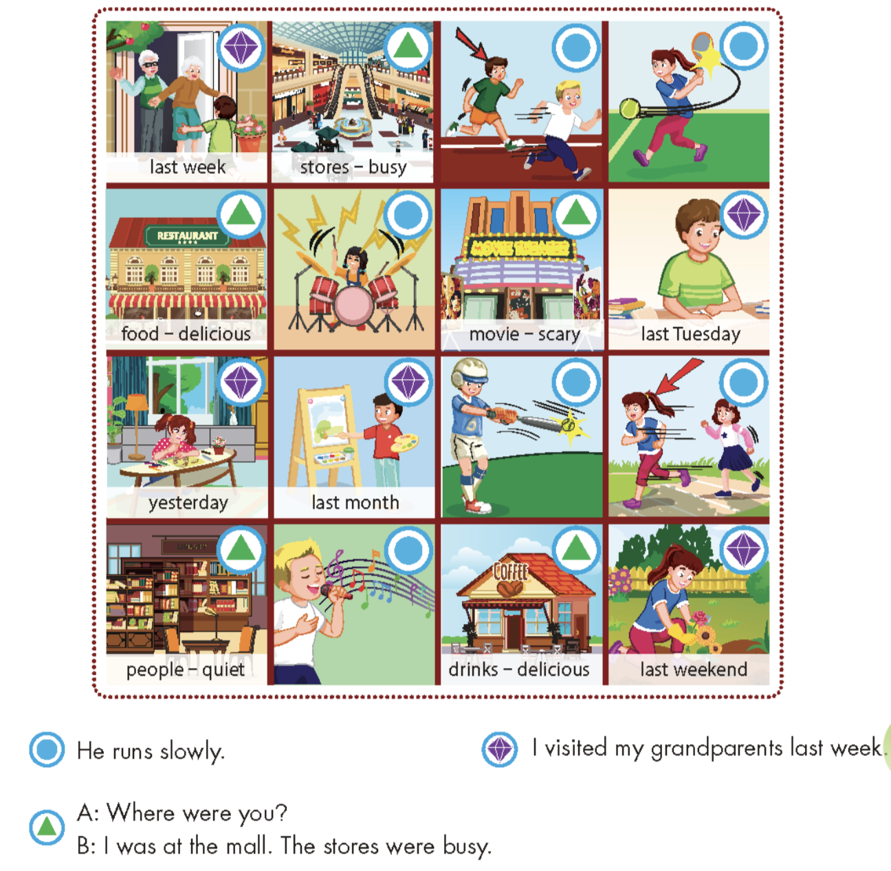 Listen and tick the box. There is an example. Look and read. The sentences from the conversation are in the wrong order. The conservation begins with (1). Number the other sentences in the correct order. Write a short conversation between two friends talking about what they did last weekend. Play the Connect three.