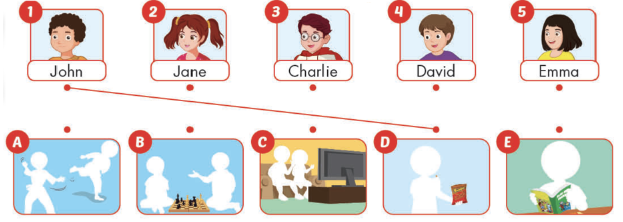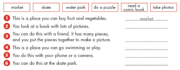 Listen and draw lines. Look and read. Choose the correct words and write them on the lines. Draw three of your friends doing activities and write about it. Play the board game. What can you do?
