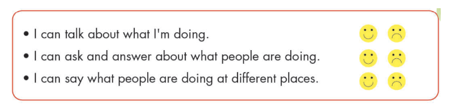 Cách chơi: Các bạn chơi lần lượt từng hình một theo một vòng như trong ảnh, với hình ảnh có kí hiệu màu tím sẽ nói mẫu câu hỏi “Are you doing something?” và câu trả lời là “Yes, I am/ No, I’m not.” với hình ảnh có kí hiệu màu vàng sẽ sử dụng mẫu câu hỏi “ Is he/she hoặc Are they doing something?” và mẫu câu trả lời là “ Yes, he/she is; Yes, they are hoặc No, he/she isn’t. He/ she’s doing something.” với hình ảnh có kí hiệu màu xanh sẽ sử dụng mẫu câu hỏi “What are you doing?” và mẫu câu trả lời là “I’m + V-ing at + địa điểm.”