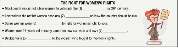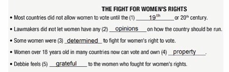 You will hear a podcaster called Debbie talking about the fight for women’s rights. For each question, write no more than two words or a number in the blank.For each question, choose the correct answer.
