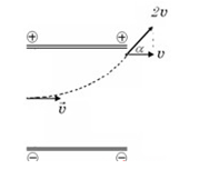 Hai bản kim loại phẳng đặt nằm ngang, đối diện, song song cách nhau một khoảng d tạo thành một tụ điện phẳng. Giữa hai bản tụ có một hiệu điện thế U. Hướng một chùm hẹp các electron quang điện có tốc độ v theo phương ngang đi vào giữa hai bản tại điểm O cách đều hai bản thì khi nó vừa ra khỏi hai bản nó có tốc độ 2v. Khi vừa ra khỏi tụ điện, véctơ vận tốc hợp với véctơ vận tốc ban đầu một góc bằng bao nhiêu?