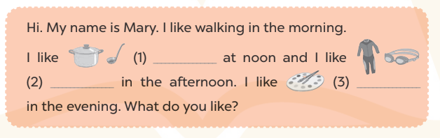 Hi. My name is Mary. I like walking in the morning. I like cooking at noon and I like swimming in the afternoon. I like painting in the evening. What do you like?
