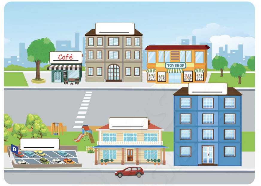 a. Ngôi trường nằm giữa sân chơi và siêu thị.