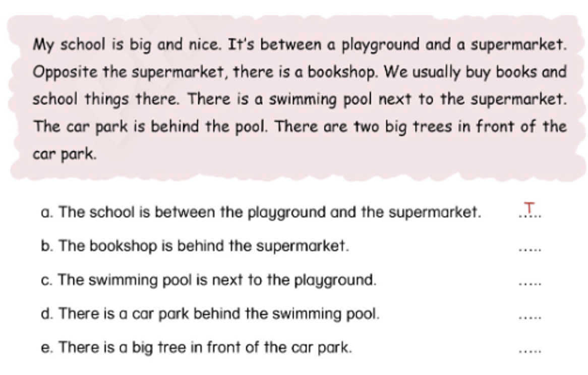 Trường của tôi rất lớn và đẹp. Nó nằm giữa sân chơi và siêu thị. Đối diện siêu thị có hiệu sách. Chúng tôi thường mua sách và đồ dùng học tập ở đó. Có một hồ bơi bên cạnh siêu thị. Bãi đậu xe phía sau hồ bơi. Trước bãi đậu xe có hai cây lớn.