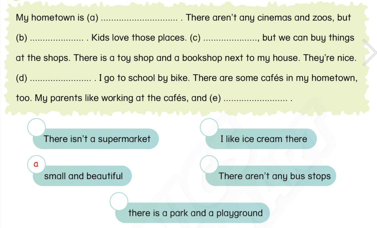 My hometown is small and beautiful. There aren’t any cinemas and zoos, but there is a park and a playground. Kids love those places. There isn’t a supermarket but we can buy things at the shops. There is a toy shop and a bookshop next to my house. They are nice. There aren’t any bus stops. I go to school by bike. There are some cafes in my hometown, too. My parents like working at the cafe and I like ice cream there.