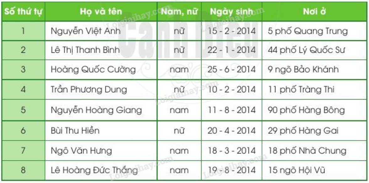 + Thứ ba là bạn Hoàng Quốc Cường, giới tính nam, sinh ngày 25 – 6 – 2014, hiện đang ở số 9 ngõ Bảo Khánh
