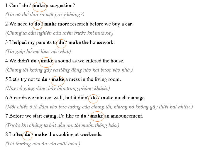 (Gạch dưới động từ đúng: do hoặc make.)