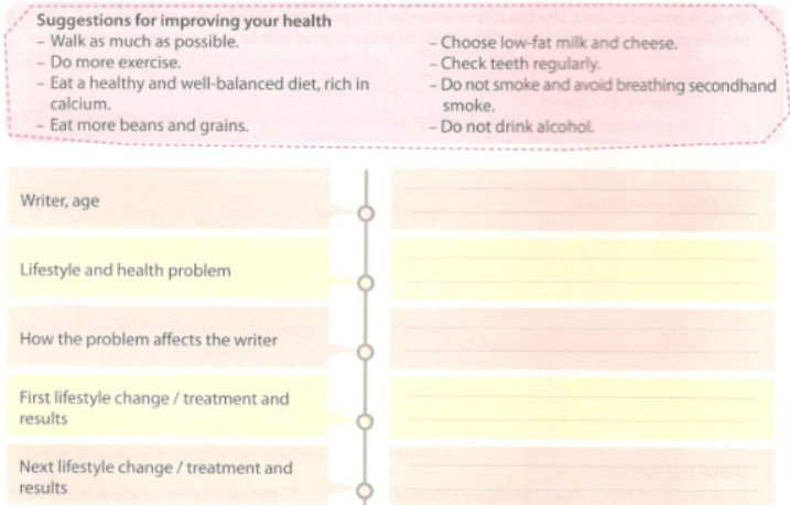 Task 2. Choose one lifestyle and health problem from and suitable suggestions from the box below to write a story about how a teenager has changed his / her lifestyle to overcome a health problem. Prepare an outline for your writing.