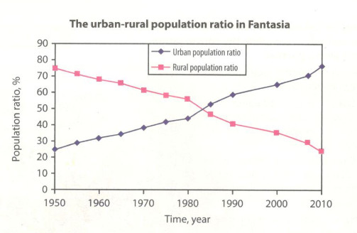 The line graph illustrates the ratio between urban and rural population in Fantasia over a 60-year period from 1950 to 2010. Overall, the ratio of urban population went up continuously, while the rural population ratio experienced a steady fall.