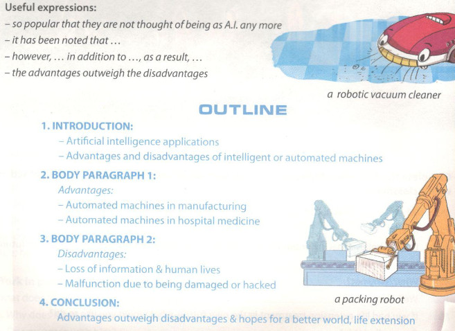 Task 2. Using the information in , the list of useful expressions, and the outline below, write a short article discussing the advantages and disadvantages of A.I. (Sử dụng các thông tin trong 1, danh sách các nhận định hữu ích, và dàn ý dưới đây, hãy viết một bài viết ngắn thảo luận về những lợi thế và bất lợi của A.I.)