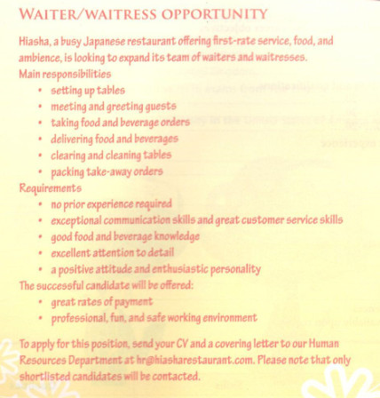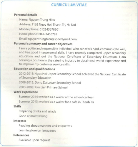 Bạn nghĩ rằng công việc bồi bàn quảng cáo ở bài 1 chính là việc bạn đang tìm kiếm. Viết CV của riêng bạn để đăng ký cho nó. Hãy nhớ điều chỉnh CV của bạn để phù hợp yêu cầu công việc để bạn có một cơ hội được lọt vào danh sách phỏng vấn.