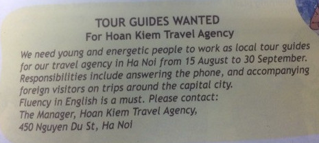 Chúng tôi cần những người trẻ tràn đầy năng lượng làm việc như những hướng dẫn viên du lịch địa phương cho công ty du lịch chúng tôi ở Hà Nội từ ngày 15 tháng 8 đến ngày 30 tháng 9. Trách nhiệm bao gồm trả lời điện thoại và đi cùng khách du lịch nước người trong các chuyến đi xung quanh thủ đô.