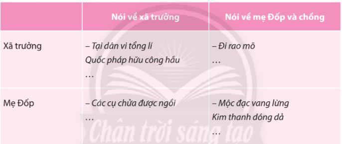 – Chú ý lời thoại của hai nhân vật Xã trưởng và mẹ Đốp khi nói về công việc của nhau.