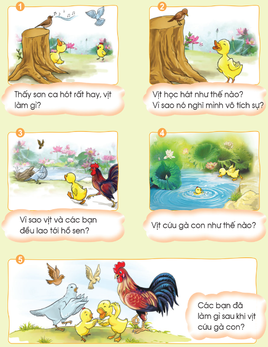 Tranh 4: Vì vịt và các bạn nghe thấy tiếng “Chiếp! Chiếp!” nên biết gà con gặp nạn rồi.