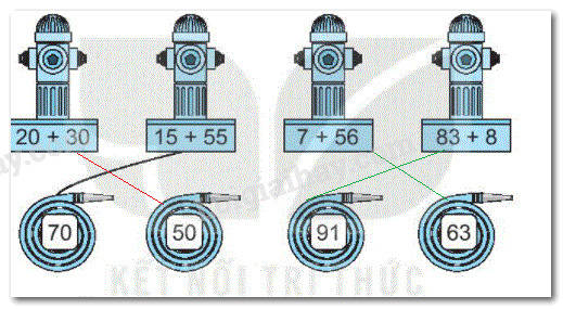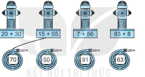 Thực hiện đặt tính rồi tính (hoặc tính nhẩm) phép cộng ghi trên trụ cứu hỏa rồi nối với số thích hợp trên mỗi cuộn dây.