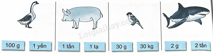 Quan sát tranh rồi chọn cân nặng thích hợp với mỗi con vật.
