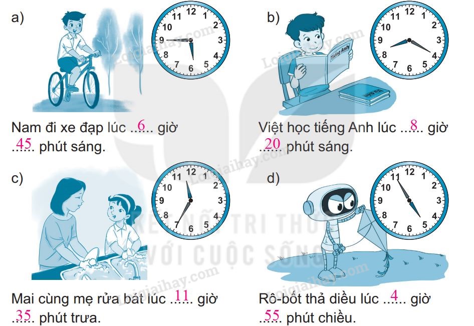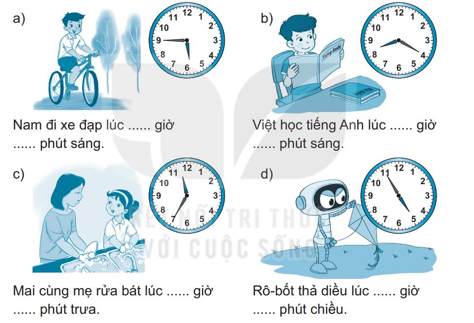 Xem giờ trong mỗi bức tranh rồi điền số thích hợp vào chỗ trống.